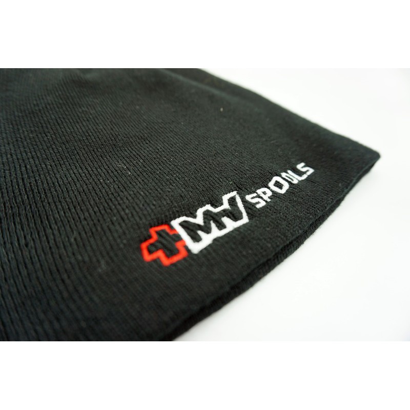 • Stijlvol ontwerp met het Mv Spools-logo in contrasterend wit op zwart.